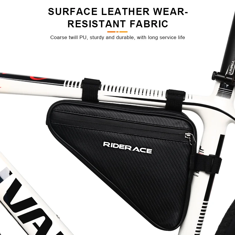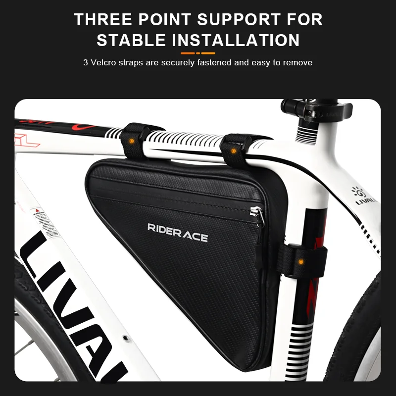 1. Cycling saddle bag easily connects under bike top tube with djustable velcro straps for custom fit.